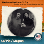 - Hand-pressed pinback buttons and magnets