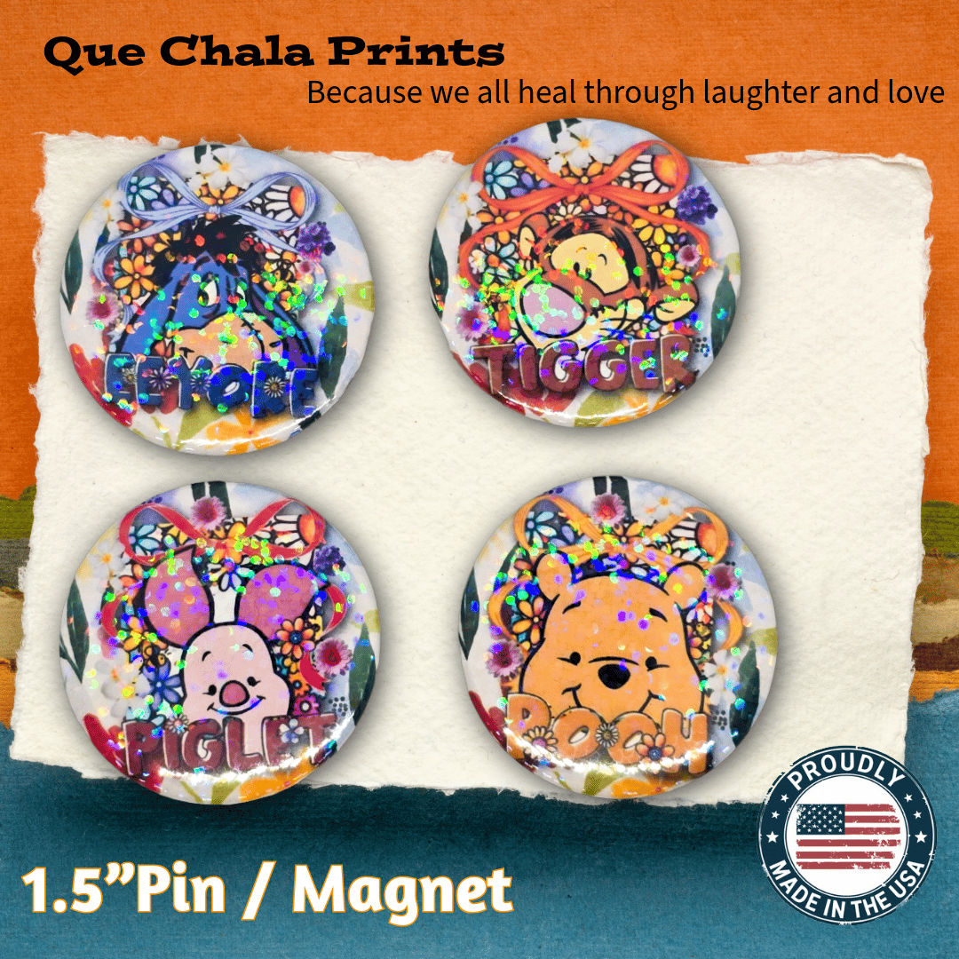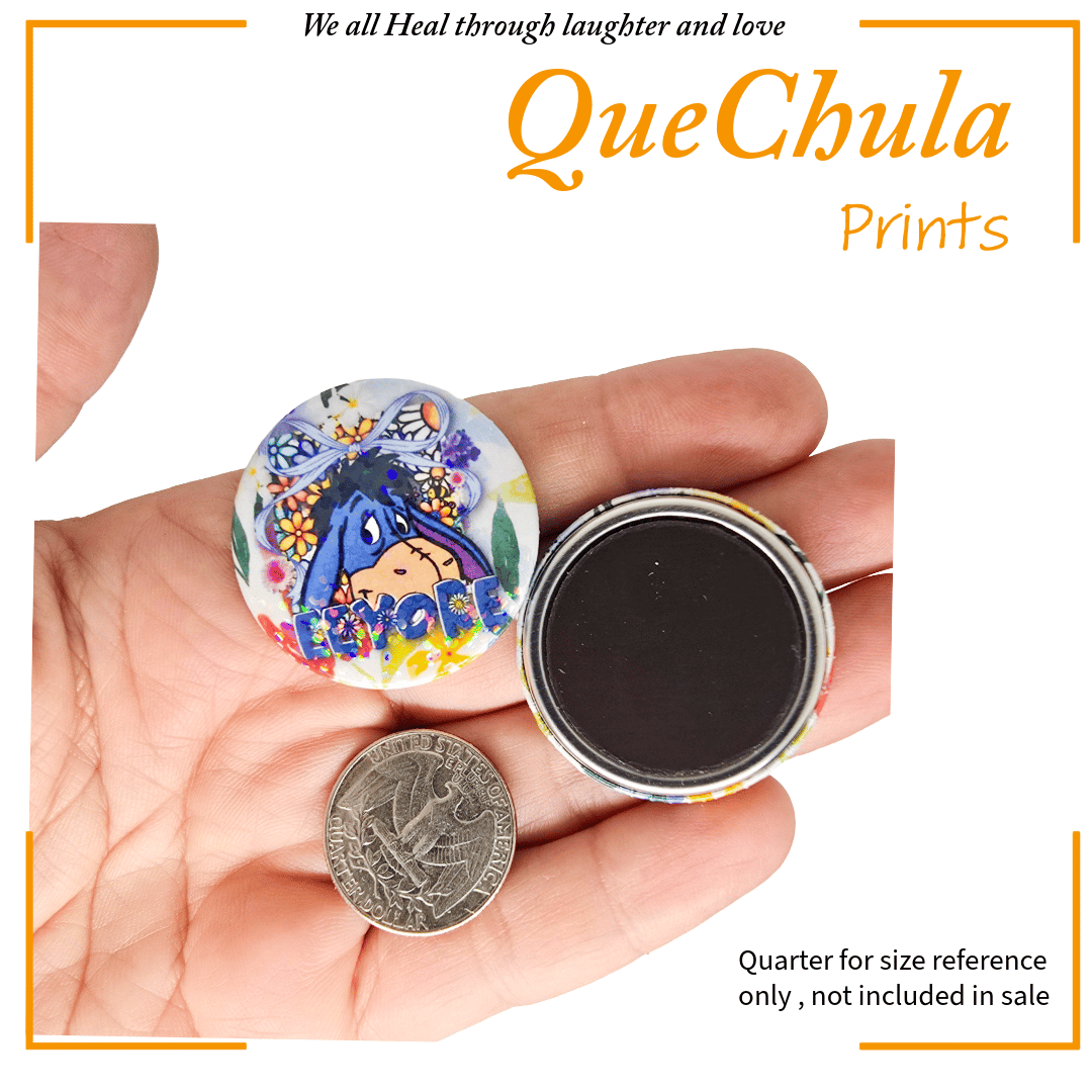 - Hand-pressed pinback buttons and magnets